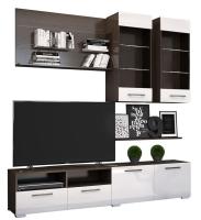 Гостиная Ненси-3 - компактная стенка для небольшой по площади гостиной скомпонована из тумбы телевизионной с нишами и выдвижными ящиками, тумбы телевизионной с распашными створками, двух навесных витрин с распашными створками со вставками из стекла и двух навесных полок. На стеклянные полки витрин возможна установка подсветки - приобретается дополнительно. Все стеклянные элементы гостиной выполнены из прозрачного стекла. Дверцы гостиной и фасады ящиков оснащены пластиковыми ручками-скобами цвета черный никель. Витрины навешиваются на стену при помощи планки и навеса универсального, навесные полки - при помощи навесов SAH302. В основании телевизионных тумб установлены регулируемые опоры. Корпусы модулей изготовлены из ЛДСП, фасады - из глянцевой МДФ в нескольких вариантах комбинаций тонировок. Универсальная сборка. Все модули гостиной можно установить по Вашему желанию.