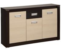Изделие обладает тремя вместительными секциями с одной полкой в каждом и выдвижным ящиком по центру.