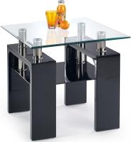 Diana H – стильный журнальный столик польской компании Halmar с квадратной столешницей из прозрачного закаленного стекла. Опоры изготовлены из лакированной МДФ. Стеклянная полка черного цвета и столешница крепятся к опорам при помощи хромированных труб.
