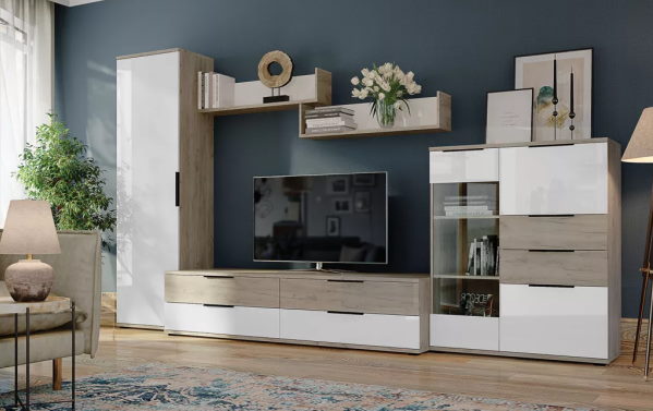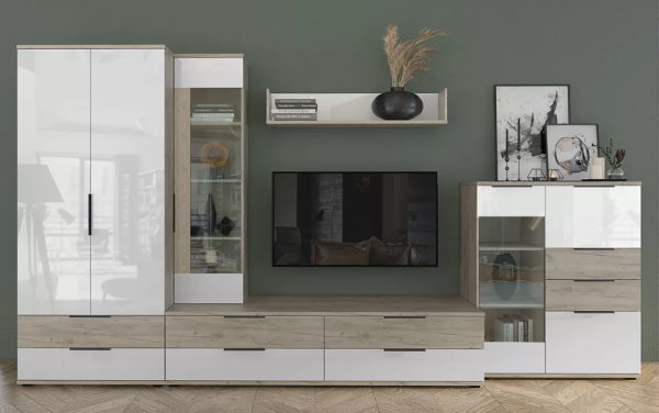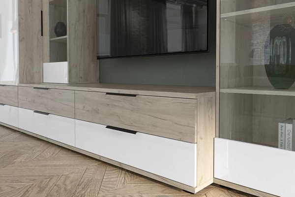 Тумба под ТВ Альянс 4 ящика 435.07 - входит в модульную гостиную Альянс. Корпус изготавливется из высококачественного ЛДСП в цвете Дуб крафт. Фасады дверей из ДСП, где два из них выкрашиваются в четыре слоя высокоглянцевой краски в автоматизированной покрасочной камере, а оставшиеся производятся из того же материала что и корпус.  Направляющие ящиков шариковые полновыкатные. Ручки из черного прочного пластика. Ножки также из черного пластика.